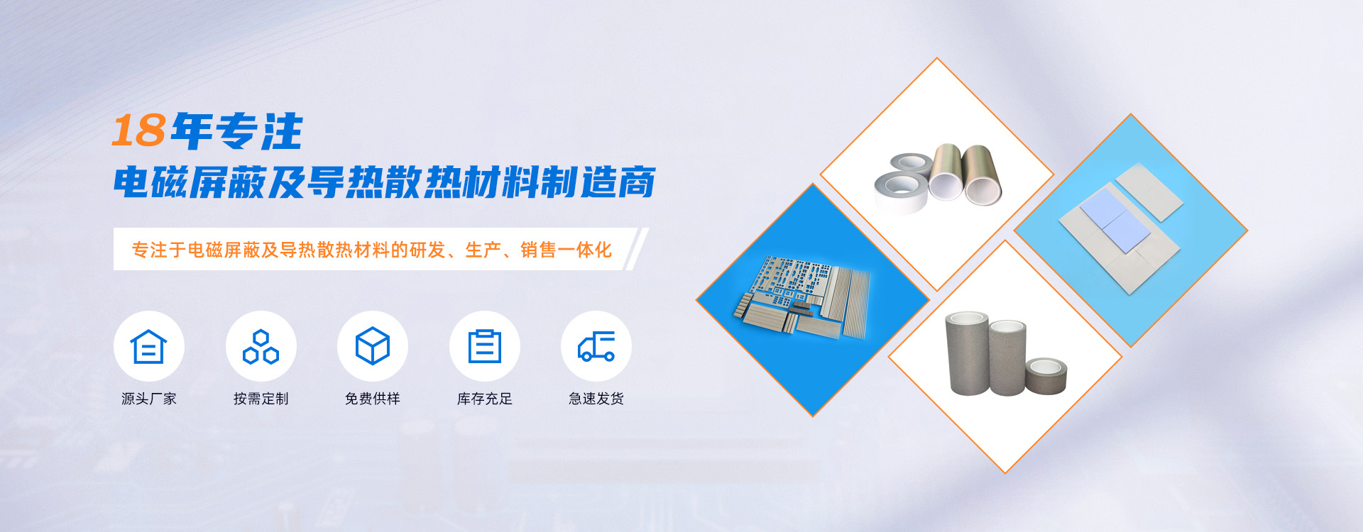 • 18— 年 — 18年專注電磁屏蔽及導熱材料的研發、生產、銷售一體化